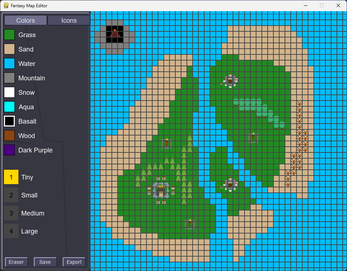 Fantasy Map Maker is a small, focused tool for building pixel‑style fantasy maps without getting lost in menus. Use a simple tile brush to paint terrain, then place icons for camps, villages, cities, mountains, forests, and more.